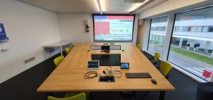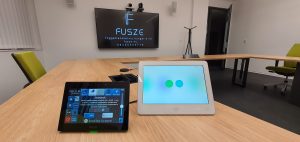 A telepített rendszer stabil alapjáért itt is a professzionális Extron eszközök felelnek, amiket a termek hátuljában, szekrényekbe rejtve, helyeztünk el, rack szekrényekben. Minden terem saját rack szekrényt kapott. A három teremnek az audióvizuális alapjai megegyeznek. A tárgyalókban található tárgyaló asztalokkal szembe kerültek elhelyezésre a hatalmas falra szerelt kijelzők. Fölöttük, rájuk szerelve kaptak helyet a konferencia kamerák és a kijelzők két oldalán egy-egy fali hangsugárzó. A tárgyaló asztalokon beépítésre kerültek az asztali dokkolók is, amik könnyű hozzáférést biztosítanak a HDMI vezetékes bemeneti forráshoz, ethernet csatlakozóhoz és a 230V-os táphoz, akár USB-n keresztül is. Az egyszerű vezérlést, azt asztalra kihelyezett érintőpanelek garantálják, amikkel választhatunk bemeneti forrást, szabályozhatunk hangerőt vele és a megfelelő fényviszonyok előállítása érdekében ezekkel kezelhetjük a termek fényszintjét is, legyen szó világítás erősségről, vagy a motorikus redőnyökről. A nagy teremben mindezek mellett helyt kapott még, egy szintén asztalra helyezett, érintő kijelzővel vezérelhető professzionális Cisco rendszer is. A termek bejáratánál a falon, itt is felkerültek az EVOKO teremfoglalói.